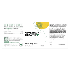 Give Back Health Immunity Plus is a premium, therapeutically dosed immune support supplement developed by a team of expert naturopaths and researchers. It helps the immune system to fight illness and helps stimulate a healthy immune response. It can be used both short term to fight illness or longer term to support immune health. Immunity Plus is available for retail, donation and practitioner use. It is a listed medicine (AUST L 370572) on the Australian Register of Therapeutic Goods (ARTG).
