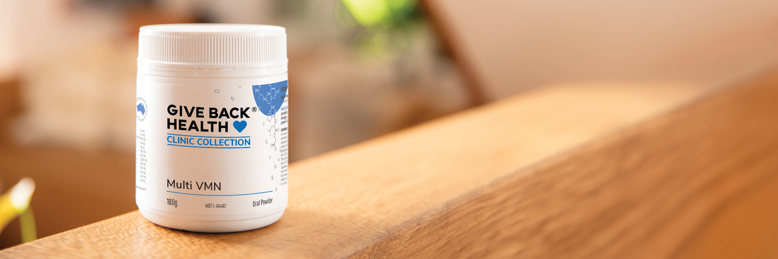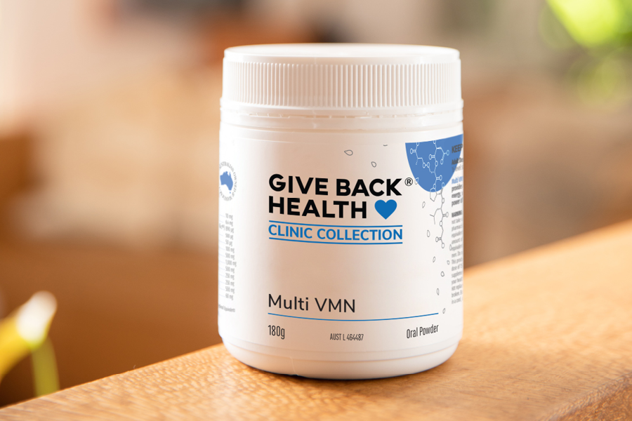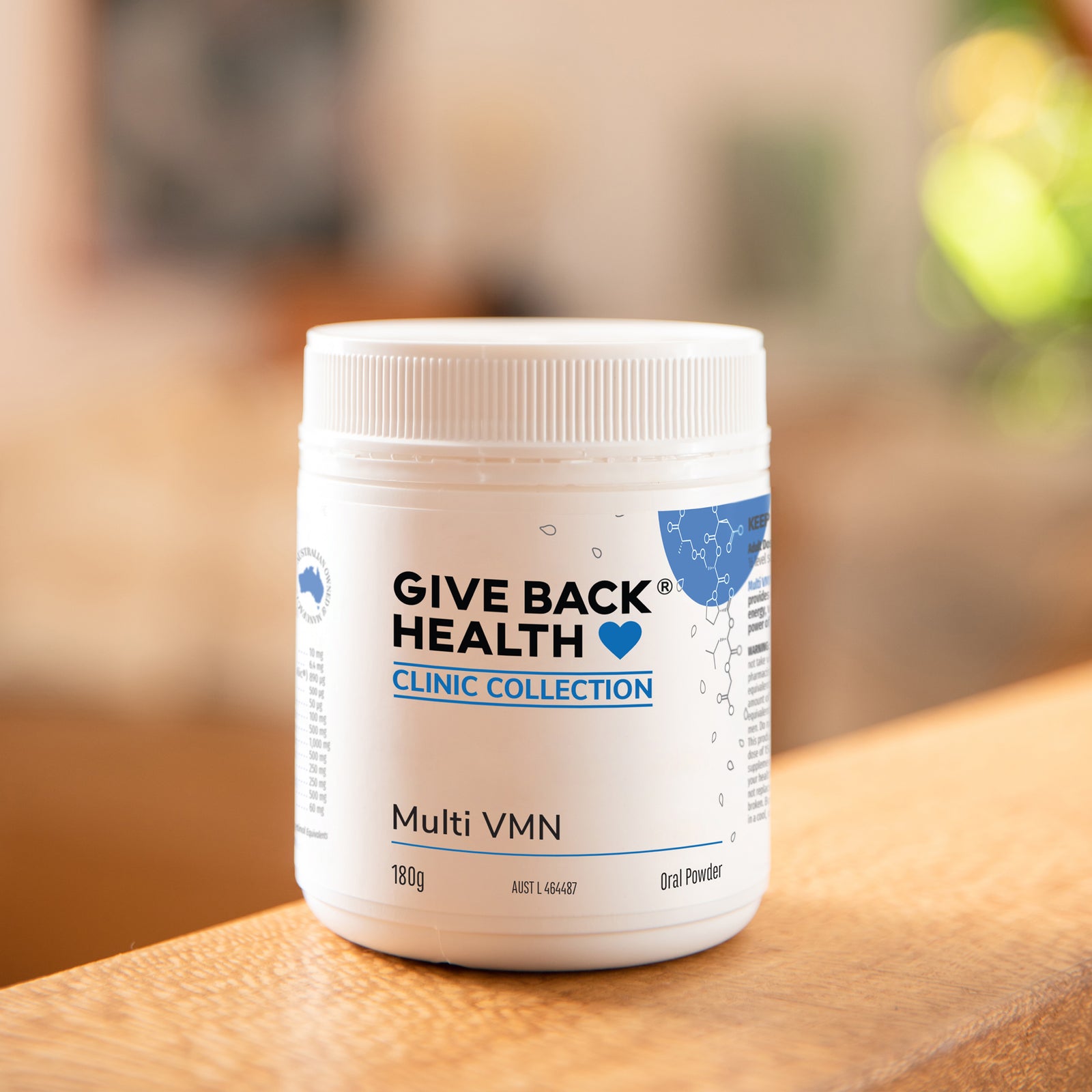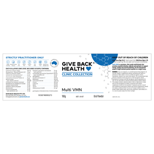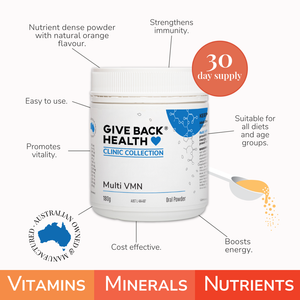 Give Back Health Clinic Collection Multi VMN is a premium, clinic grade multivitamin that provides essential vitamins, minerals and nutrients to support energy, vitality and overall wellbeing. Co-created with expert nutritionists and naturopaths to be the most comprehensive multi available, Multi VMN is clinically formulated to address dietary gaps and deliver complete foundational nutritional support. Multi VMN comes in a clean, low excipient, nutrient dense powder that has a sulfite free natural orange flavour and delivers the therapeutic power of eight nutrient packed capsules in a single scoop. It is a listed medicine (AUST L 464487) on the Australian Register of Therapeutic Goods (ARTG) and comes in powder form.