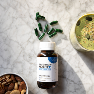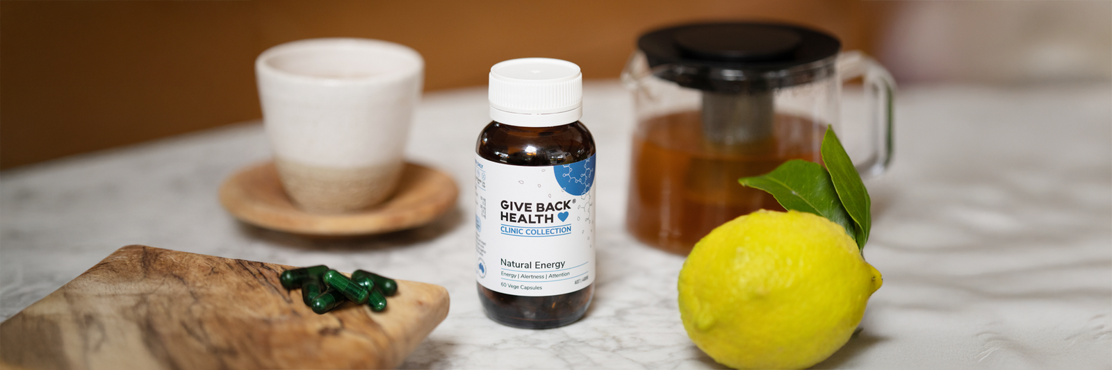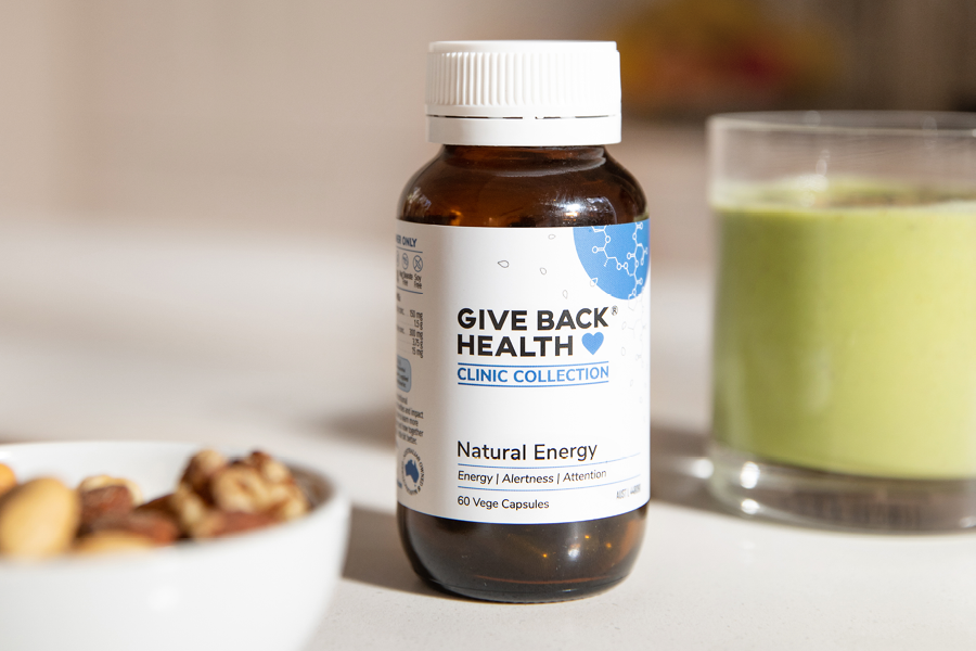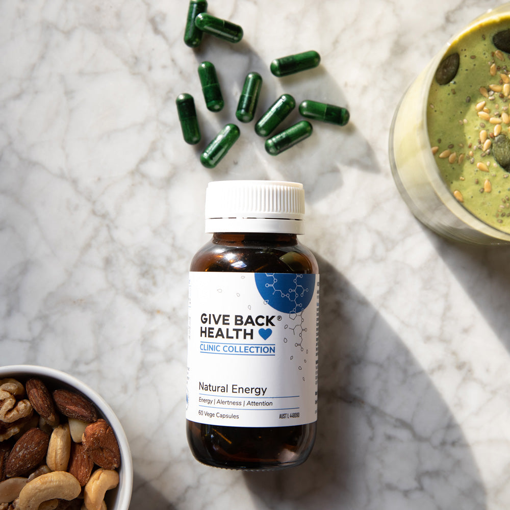 Give Back Health Clinic Collection Natural Energy Natural Energy helps you claim back energy, focus and presence by combining intuitive naturopathic insight with robust scientific validation. It optimises energy, concentration, memory, focus and overall mental state by balancing the brain, adrenals, and nervous system through enhancing what’s needed and reducing what isn’t. Featuring two potent, sustainably sourced and human clinically trialled natural herbal extracts, it combines enXtra® to increase attention span, mental alertness, wakefulness and mental endurance, with KSM-66 Ashwagandha® to reduce stress, anxiety, fatigue and cortisol. It is a listed medicine (AUST L 448090) on the Australian Register of Therapeutic Goods (ARTG) and comes in capsule form.